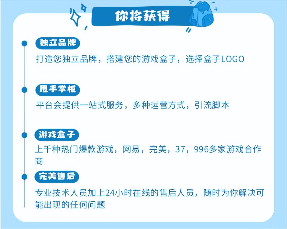 动感地带游戏十分体贴的将手游代理的技术门槛降低到最舒服的程度。代理商要做的只是想出一个响亮的品牌名字,平台会提供一站式服务,做一个名副其实的“甩手掌柜”。成为动感地带游戏手游代理后,拥有自己的品牌标识和玩家归属权,新游戏可以根据需要添加到游戏盒子中,并且享受定制开发功能服务,后面的新版本也能免费更新。